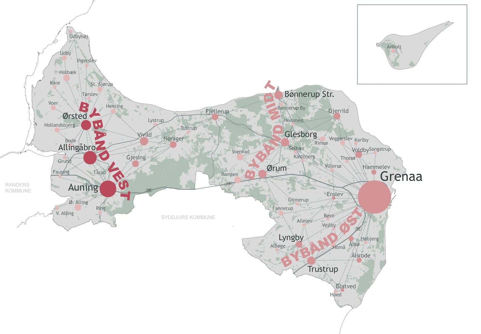 Bybåndet har tætte relationer til Randers, som er den nærmeste større by, men forbindelsen til Aarhus er ligeledes god. Det er let at komme til E45 fra byerne, og de har derfor stort potentiale som bosætningsbyer i det østjyske vækstcenter.